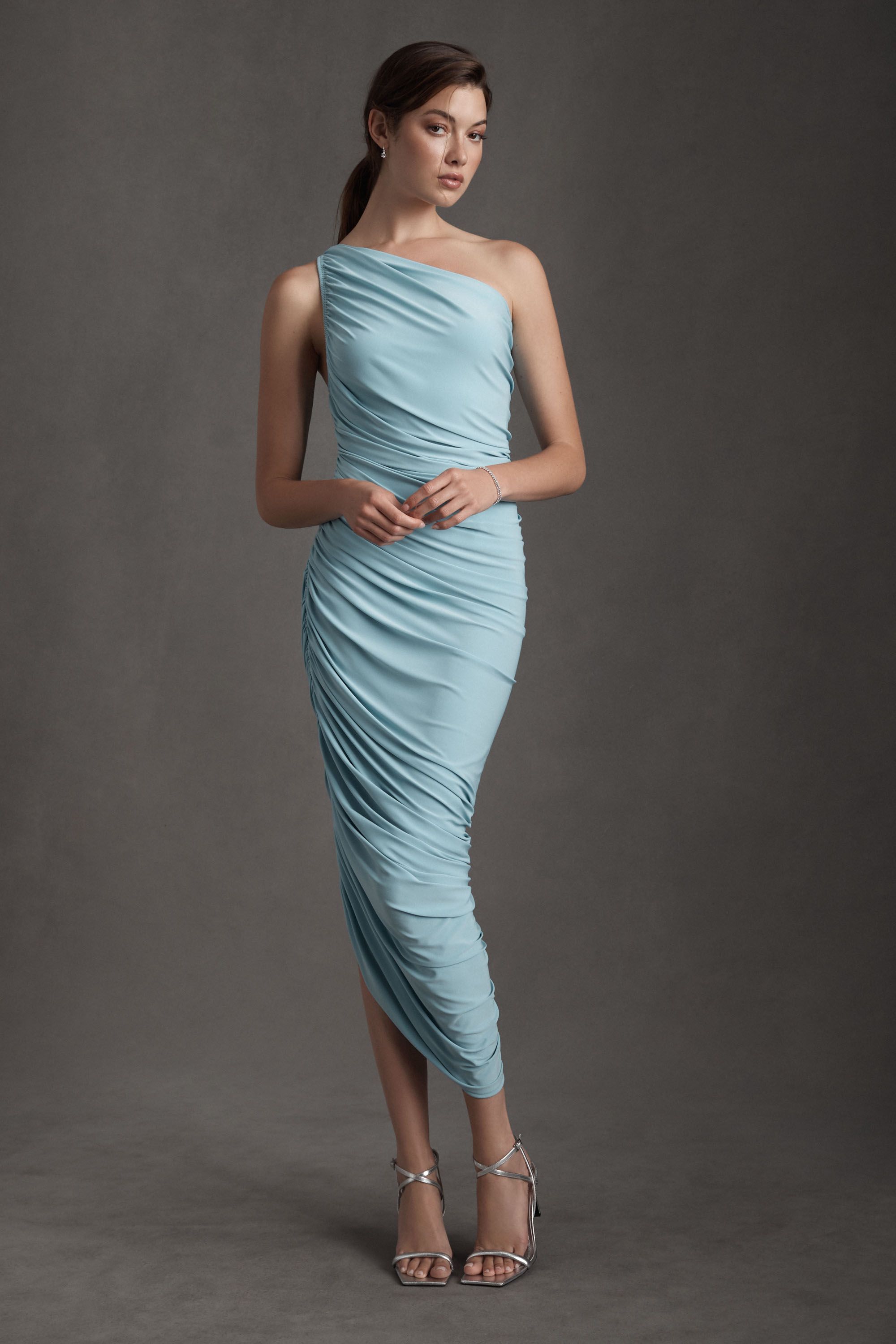 Blue Diana One Shoulder Ruched Stretch Jersey Dress Norma Kamali Net A Porter